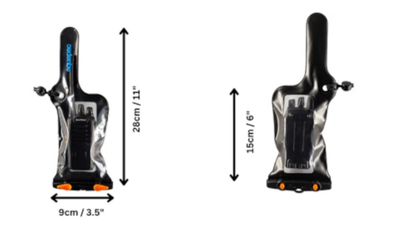 This is the Aquapac Mini VHF case. Fits most lightweight VHF and UHF Mini radios like Baofeng and Wuoxon brands.
