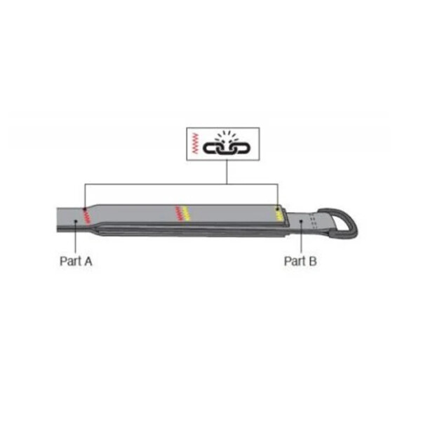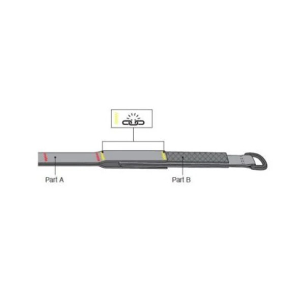 Yellow webbing is threaded at the D-ring with red fixing: resistance is high!