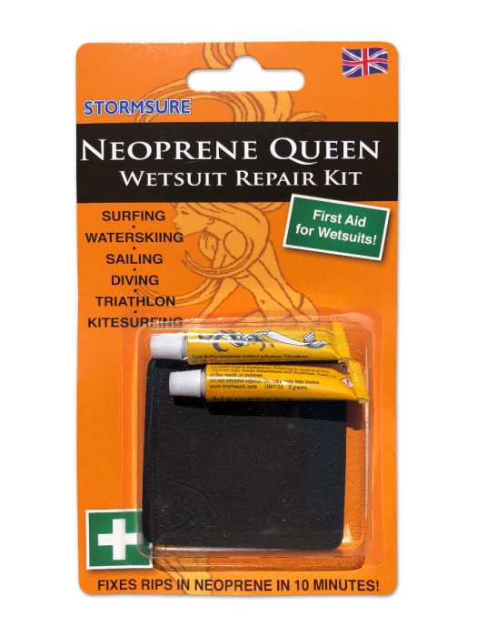 Neoprene Queen, or neo queen, is a black liquid Neoprene adhesive which can glue rips, splits, unstitched seams, damage in your wetsuit quickly repairing them on the beach or where ever, with or without a patch, allowing you back in the water in just a few minutes.