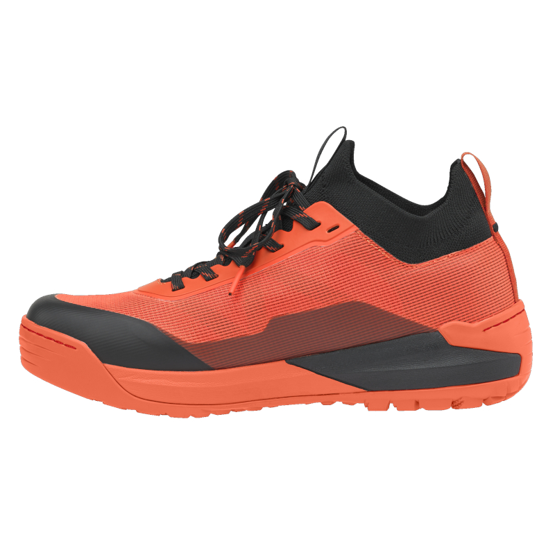 A breathable mesh upper with PU welded reinforcements balances low weight with durability, while a knitted ankle sock keeps debris out and the fit locked in.