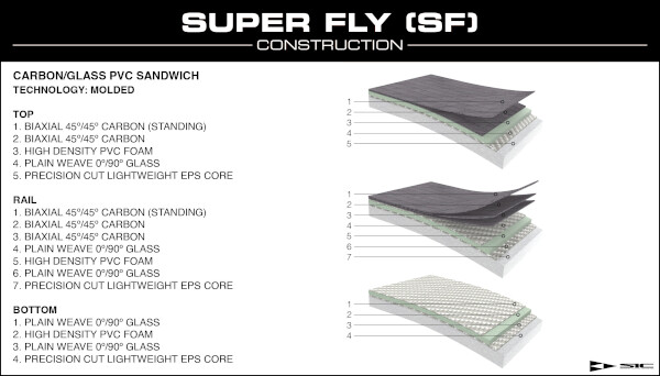 SUPER FLY (SF) is constructed with a lightweight EPS core that is fully wrapped in high-density PVC tip-to-tail and 360 degree around the rail and then sandwiched between fiberglass and carbon fibre for superior stiffness, durability, and performance.